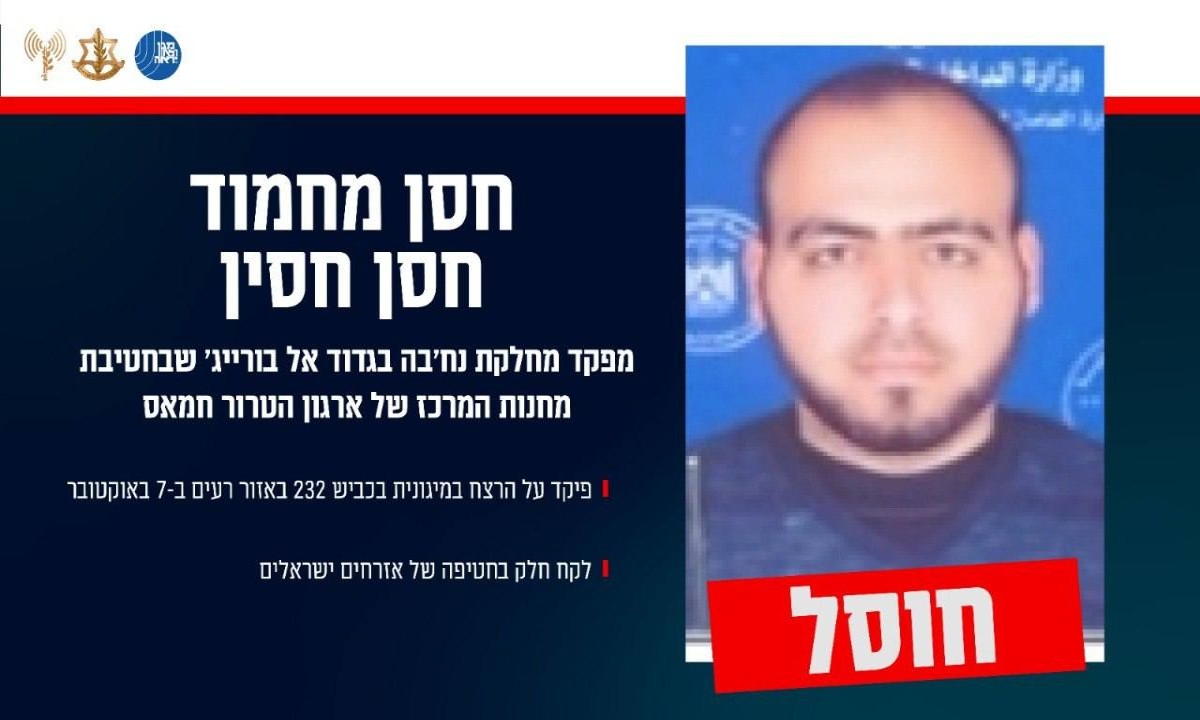צה"ל חיסל את המחבל חסן מחמוד חסן חסין, שפיקד על הרצח במיגונית בכביש 232 באזור רעים בטבח הרצחני של חמאס ב-7 באוקטובר
