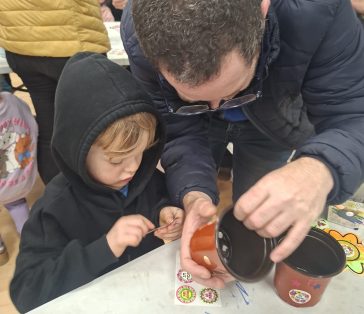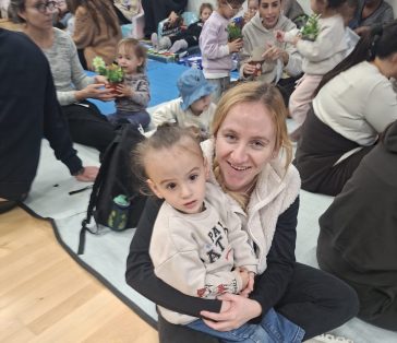 מהתמונות עלה חיבור מיוחד: אבות ואימהות יושבים לצד ילדיהם, מסייעים בשתילה, בוחרים מדבקות, מסבירים, מחייכים – ויוצרים יחד רגעים קטנים של משמעות. בהמשך התכנסו המשתתפים למפגש משותף, שבו עשרות ילדים ישבו בקשב ובהתרגשות, באווירה חמה, רגועה ומשפחתית.